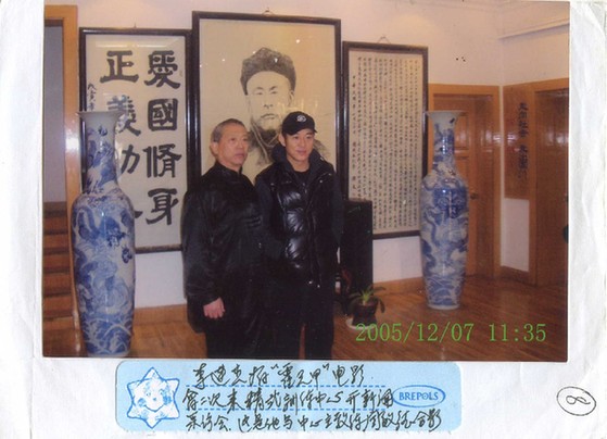 2005年,李连杰在拍摄电影《霍元甲》特来精武体育总会训练中心时,与当时的教练周敏德合影留念。